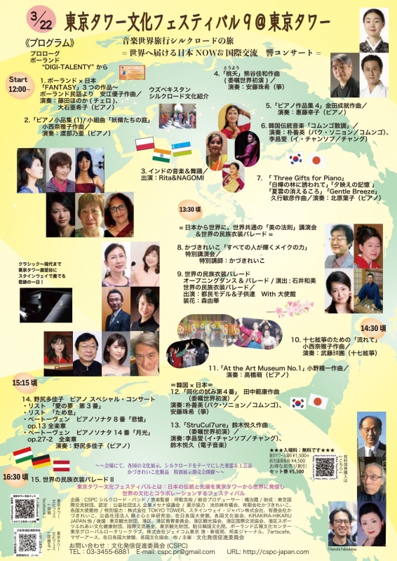 東京タワー文化フェスティバルは、国際文化交流の促進を目的とし、国内外のアーティストが一同に会する貴重な機会を提供しています。今年度も、世界中への公開生ライブ配信も行いながら、東京タワーにて開催します。今年はポーランド、ウズベキスタン、インド、韓国他とのコラボレーションコンサートを開催。さらに小・中学生を招待するなど、次世代の若者にも力をいれたフェスティバルです。