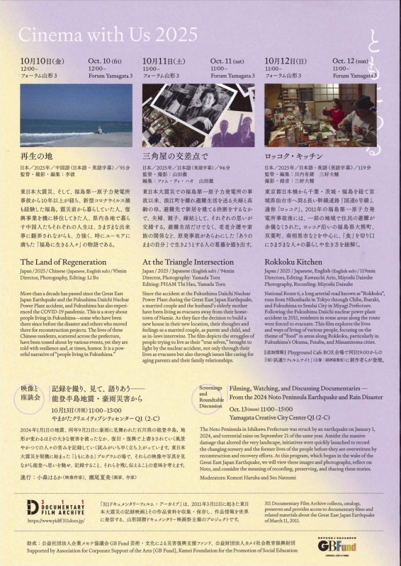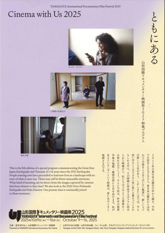 山形国際ドキュメンタリー映画祭2025において、震災記録映画特集プログラム「ともにある Cinema with Us 2025」を企画・実施した。本プログラムでは、東日本大震災関連の新作3作品の上映と、2024年に発生した能登半島地震・豪雨災害に関する座談会を、10月10日から4日間にわたり行った。