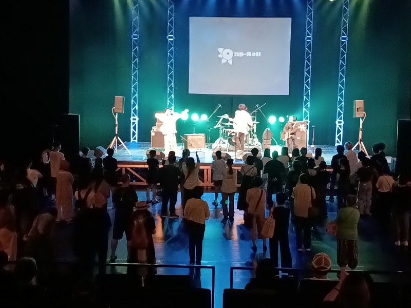 企画段階から高校生主体で集まって会議を行い、タイトルの決定、チラシ・チケットの作成、背景や演出、BGMなどの検討や準備を行いました。出演バンドはそれぞれ個性あふれる表現力豊かなクオリティでした。エンディングは参加メンバー全員がステージに上がり、観客も巻き込んでみんなで大合唱。観にきた小さな子どもたちも大人たちも高校生からたくさんエネルギーをもらいました。