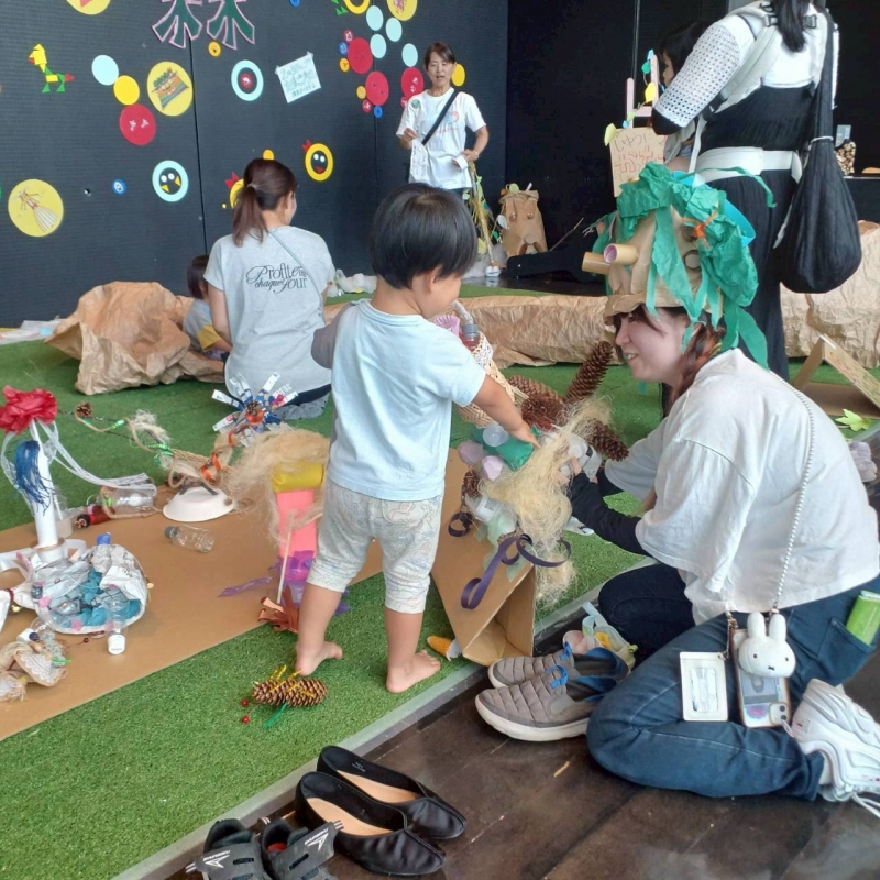 プロの講師を迎え、3つのワークショップを企画しました。身近にある材料や廃材をつかって森に住むふしぎな生き物をつくったり、長いロール画用紙にローラーや身体をつかってスタンプあそびをしたり、自由な発想で表現することを楽しみました。できあがった作品は会場に飾り会期中を盛り上げてくれました。また、自分でつくった楽器をつかってみんなで合奏をする楽しさや、素朴な音色から大勢でのダイナミックな演奏まで体験しました。