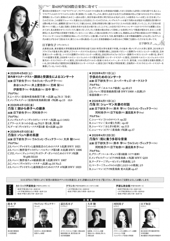 第6回となる今回は「芸術の都・ライプツィヒの4つの肖像」と題し、古くから多くの音楽家が集まってきた街ライプツィッヒで活躍したバロックから後期ロマン派までの作曲家の作品を組み合わせ、4つの「肖像」として表現します。演奏会場はメインとなるカトリック芦屋教会のほか、初めてクラシカ、芦屋仏教会館でも開催。前回より実施している「室内楽マスタークラス」、日下紗矢子がスーパーキッズ・オーケストラと共演する3歳以上のお子様入場可の「子供のためのコンサート」など、4日間6公演を多彩なプログラムでお届けします。